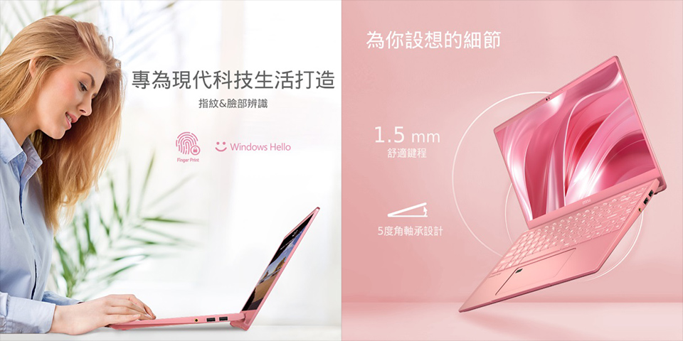 對於創意工作者而言,資料安全與使用的便利性是工作中重要的一環。Prestige 14 系列提供支援 Windows Hello 功能的臉部辨識、指紋辨識功能,不僅能比輸入密碼快上三倍的速度登入,更能完整保護重要資料與商業機密安全!搭配 FIDO 2 認證功能,輕鬆享受不需輸入密碼即可登入網路服務的便捷生活!此外,Prestige 14 採用精準的 5 度角軸承設計,開啟時能順勢將鍵盤增高至最佳的使用角度,優化的 1.5mm 鍵程,能提供使用者更舒適的回饋力道,帶來絕佳的使用體驗。