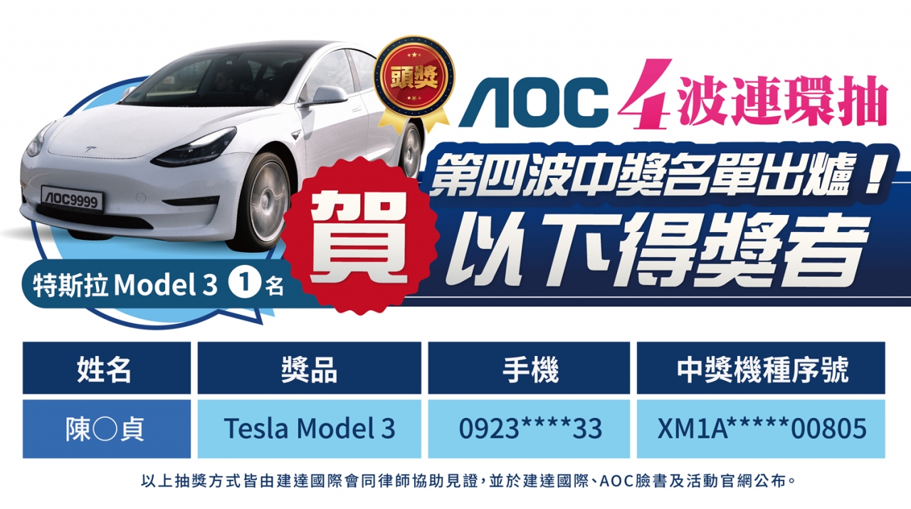 AOC大型顯示器為了感謝消費者多年來的支持、破天荒不手軟,「四波大獎」連環抽活動,第三、第四波的幸運得主 已經正式出爐了!