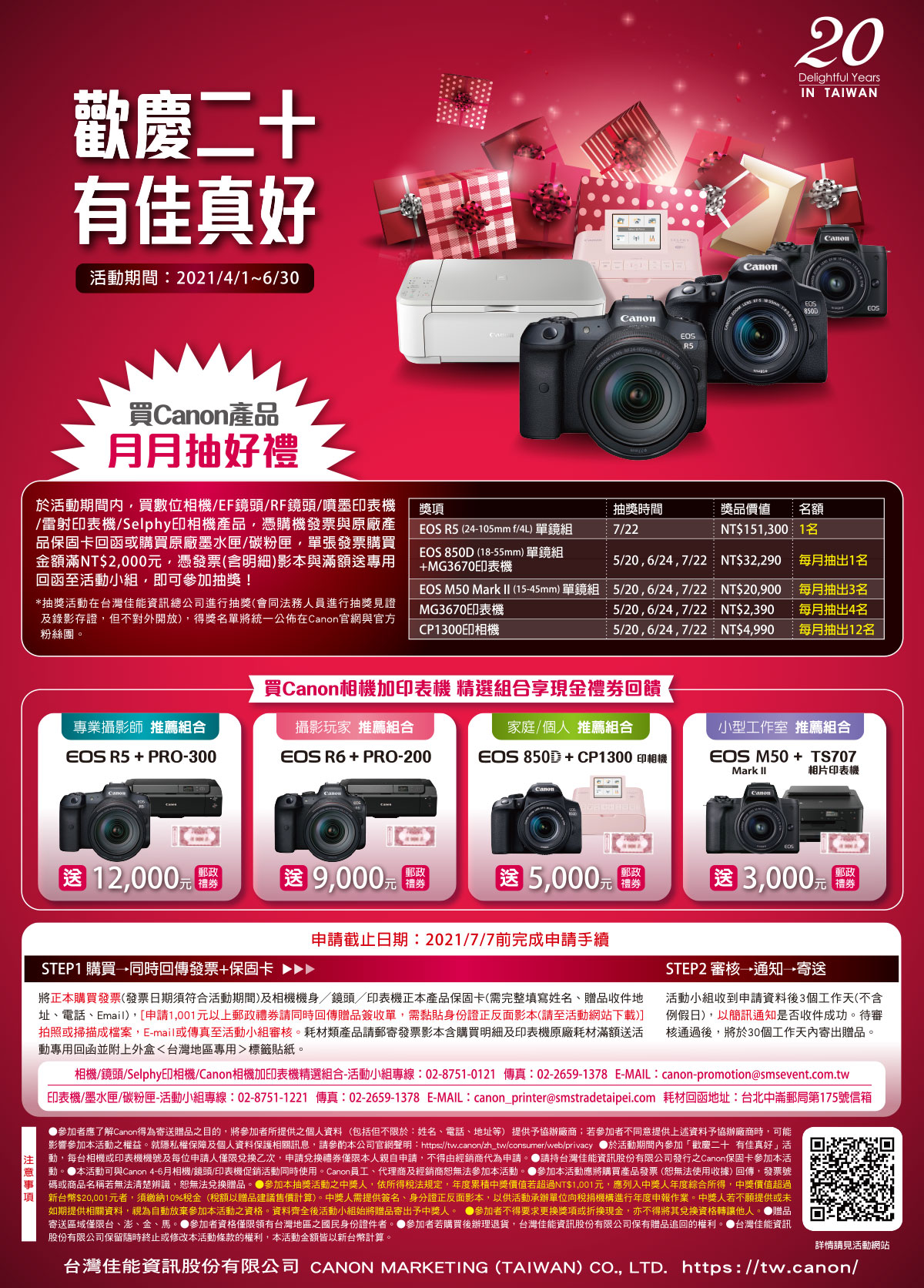 歡慶二十,有佳真好。買Canon相機+印表機,精選組合享現金禮券回饋。