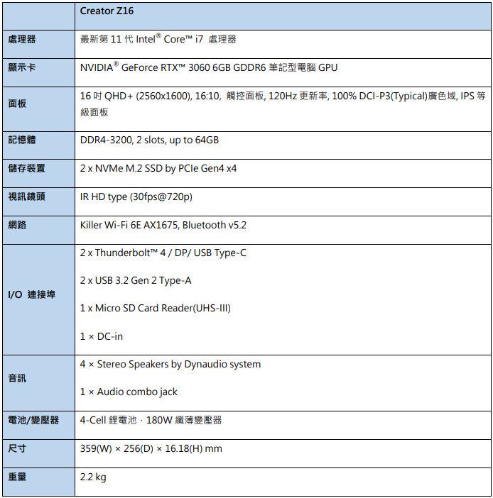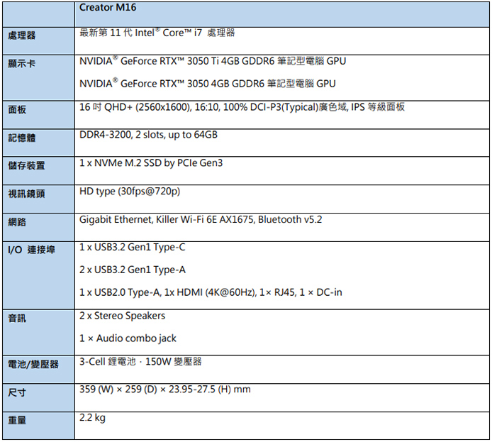 全新 Creator M16 同樣採用 True Pixel 顯示技術打造的 QHD+ 超高畫質面板,機身更加輕巧便攜,是為個人創作者提供的另一項選擇。