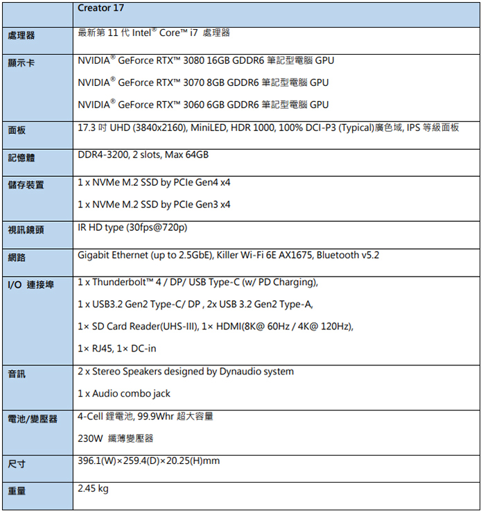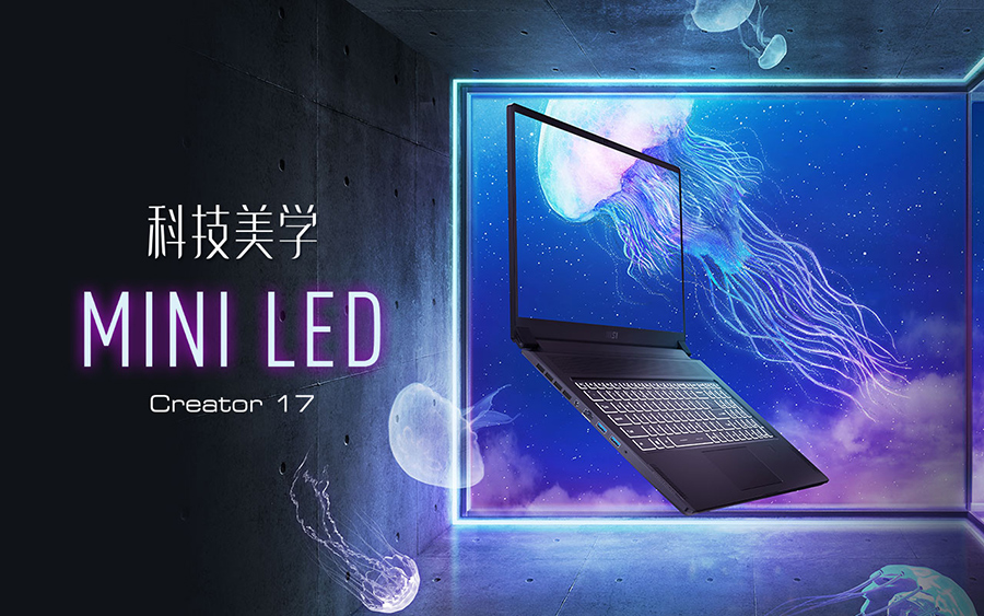 升級推出的 Creator 17 創作者筆電搭載生動鮮明的 Mini LED 面板,採用 AUO AmLED 的前瞻顯示技術,能提供 1,000nits 的超高亮度,與經過 VESA 認證,符合 DisplayHDR 1000 標準,提供更廣的色彩範圍,這些先進技術皆完美地融合在 Creator 17 以霧黑噴砂處理的鋁合金纖薄機身中。