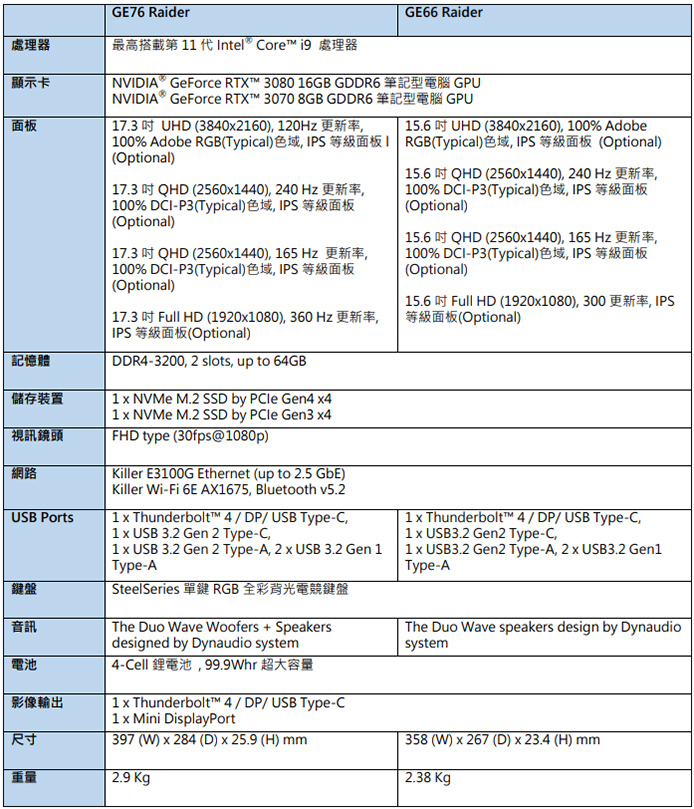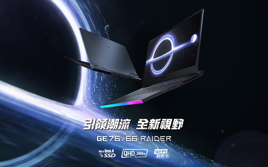如同太空船以飛快的速度與極致的性能在宇宙間穿梭,GE76 / GE66 Raider 最高搭載全新第 11 代 Intel ® Core ™ i9 處理器,及 NVIDIA ® GeForce RTX ™ 3080 獨立顯示卡,最高可達 165W TGP 完整釋放強悍顯示性能。最具指標性的 Mystic Light 全景炫彩燈效讓玩家成為遊戲戰場上最璀璨的光芒,採用 QHD 超高畫質 240Hz 更新率或 FHD 高畫質 360Hz 極速更新率的電競面板,帶來極致流暢且細緻的遊戲畫面,支援最新 Wi-Fi 6E 提供流暢穩定的無線網路體驗,全新 Cooler Boost 5 全新酷涼散熱系統,使 CPU 和 GPU 皆能發揮完整效能。GE76 / GE66 Raider 以最全方位的功能與特色重裝降臨遊戲戰場,帶領遊戲玩家超越極限!