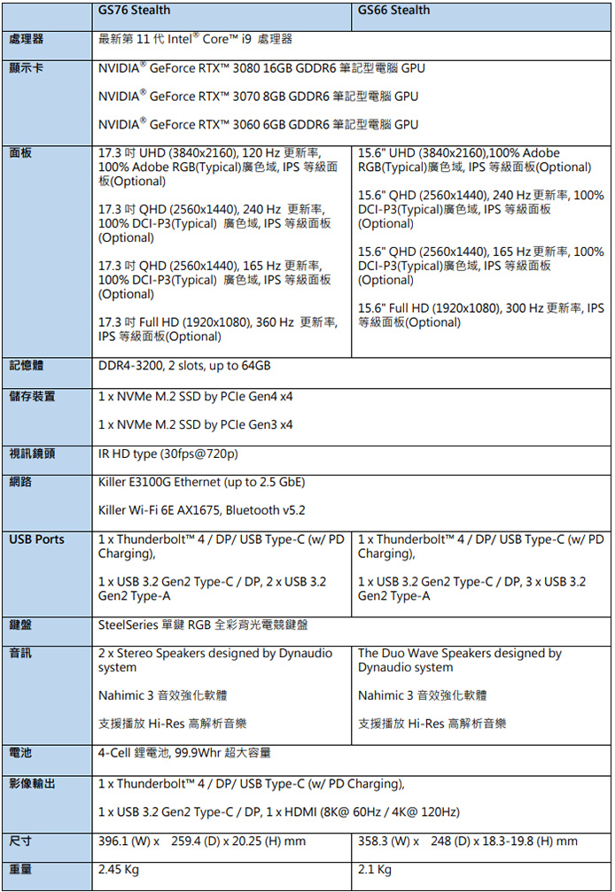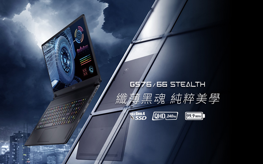 採用俐落黑魂設計的 GS76 / GS66 Stealth 最高搭載最新第 11 代 Intel ® Core ™ i9 處理器與 NVIDIA RTX 3080 顯示卡,全新 GS76 Stealth 除了規格升級,更帶來多項特點,包括採用全新銀色塗裝軸承設計、99WHr電池容量以及最高採用 QHD 超高畫質 240 Hz 更新率電競面板,不論在白天你是專業的工作者,或是夜晚變身為熱血的重裝玩家,GS76 / GS66 Stealth 都將讓你成為都會王者,在茫茫人海中脫穎而出。