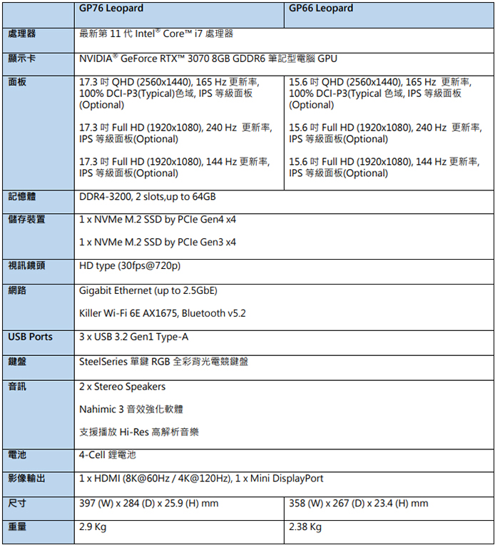 為效能而生的 GP76 / 66 Leopard 電競筆電搭載第 11 代 Intel ® Core ™ i7 處理器與 NVIDIA RTX 30 系列獨立顯示卡,擁有強大而穩定的性能且內斂成熟設計,不論是科技工程運算、高階工程計算或複雜的設計需求,GP76 Leopard 皆能完美承接使用者的多工需求,成為最強悍的後盾。