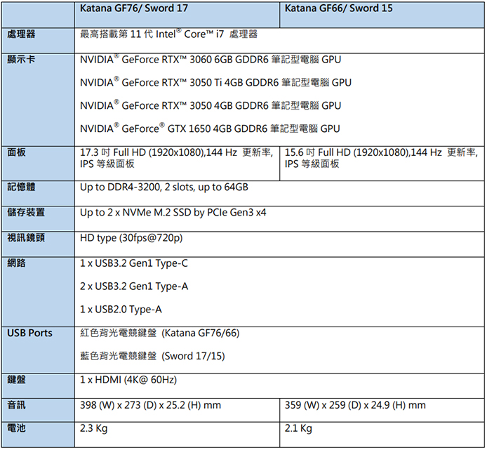 全新 Sword / Katana GF 系列電競筆電的設計靈感來自於武士刀,並邀請知名的日本專業遊戲角色插畫師長野剛 (NAGANO TSUYOSHI) 精心打造產品視覺。傳說,在亙古時代,有一把封印著龍魂之力的傳說名刀流傳於世,它鋒利如雷切、堅韌如金石;每次揮舞,將能颳起如颶風般的疾風,每次刺擊,都將燃起漫天火勢;這把傳說名刀由代代從事冶煉鍛造的龍魂一族所打造,沒有任何武器可與之匹敵,人們將它稱為「龍魂之刃」。全新 Sword / Katana GF 便是 MSI 為玩家量身打造的「龍魂之刃」,搭載最新第 11 代 Intel ® Core ™ i7處理器和 NVIDIA ® GeForce RTX ™30 系列顯示卡,採用如同鍛造利刃的精密工藝製程,Sword / Katana GF 將以優異的效能表現幫助玩家在戰場上克敵制勝。