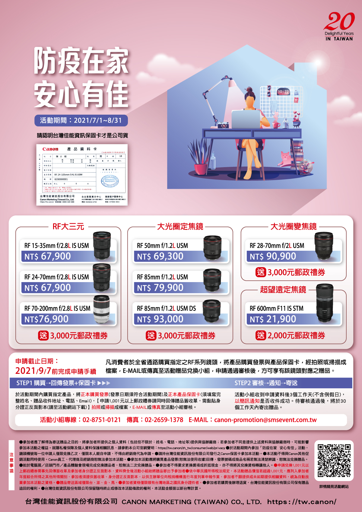 Canon 防疫在家,安心有佳。買指定鏡頭送3,000元郵政禮券!活動時間:2021/7/1-8/31。