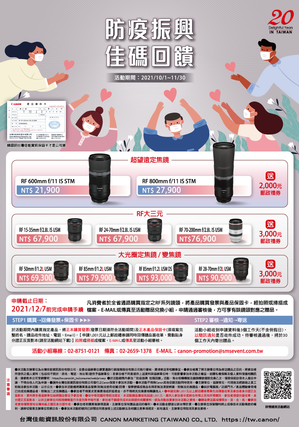 Canon 防疫振興,佳碼回饋。買指定鏡頭送3,000元郵政禮券!活動時間:2021/10/1-11/30。