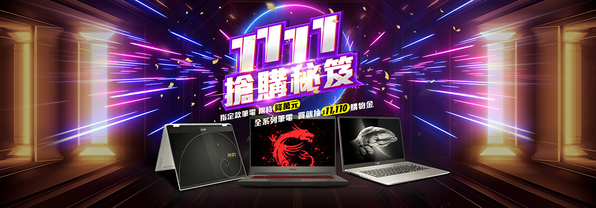 ↑MSI「1111搶購秘笈」活動指定機款限時破盤省萬元,全系列筆電買就抽LINE POINTS $11,110獎