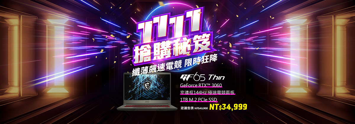 要有好的遊戲和影音娛樂享受,螢幕絕對是關鍵之一! GF65 Thin搭載15.6吋高畫質IPS等級電競面板,更新率達144HZ能帶來順暢平滑的畫面,任何遊戲的細節決不錯過!聽覺部分,GF65 Thin支援播放Hi-Res高解析音樂,享受高解析音樂帶來的頂級的聽覺體驗,聆聽前所未有的優異音質!此外,GF65 Thin搭載Dragon Center軟體,不僅能監控系統狀態,還提供獨家電競模式,一鍵就可以輕鬆完成遊戲優化設定,幫助玩家輕鬆完成遊戲設定,達到最好的表現。GF65 Thin原價NT$43,900,1111限時破盤搶購價NT$34,999,絕對是同級CP值最高的選擇,數量有限,售完為止。