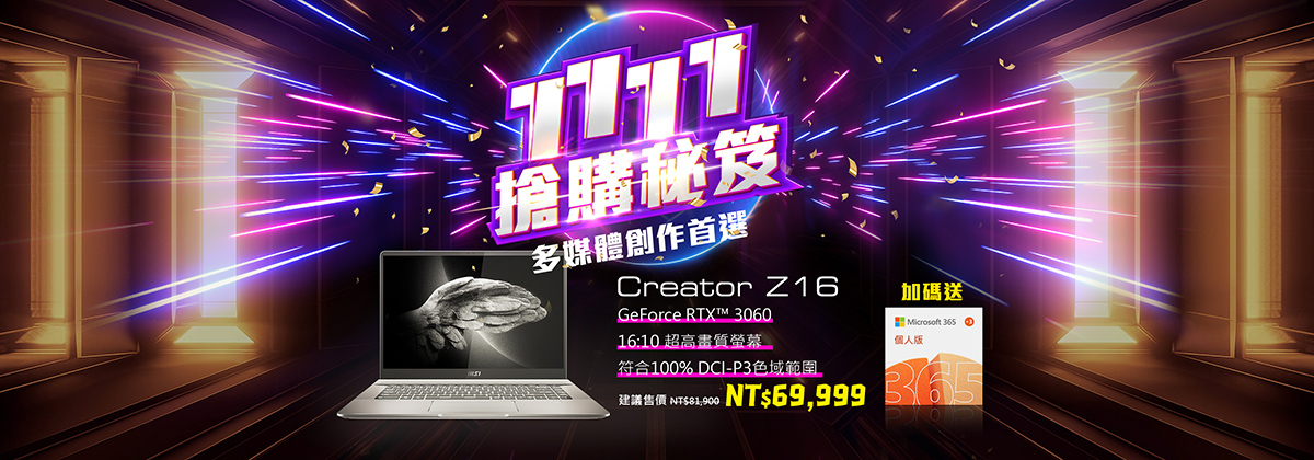 1111更新你的工作配備正是時候!Creator Z16原價NT$81,900,1111限時特賣NT$69,999,加贈Microsoft 365個人版一年期。