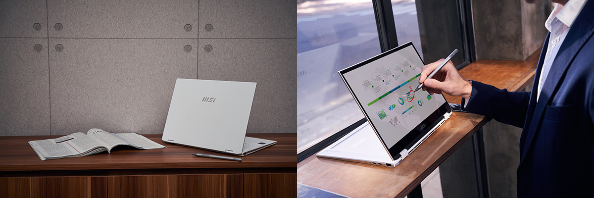 ↑Summit E13 Flip Evo採用360度翻轉設計,搭配使用專屬MSI Pen能完美融入各種工作情境