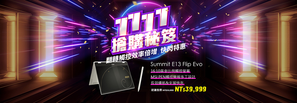 年度盛事雙11大檔即將到來,MSI搶先推出「1111搶購秘笈」,11/8-11/28活動期間購買1111指定款筆電,立即享超過萬元折扣!纖薄飆速電競GF65 Thin挑戰GeForce RTX™ 3060同級破盤價只要NT$34,999,多媒體創作首選Creator Z16搭載以True Pixel顯示技術打造的QHD+超高畫質面板,為創作者與設計師提供最精準且鮮明的色彩,1111限定現省萬元!翻轉觸控商務筆電Summit E13 Flip Evo,是筆電也是平板,搭配專屬MSI Pen能完美符合各種工作情境使用需求,幫助商務人士翻轉邁向新高度,折扣破萬輕鬆入手!「1111搶購秘笈」活動期間,於授權經銷通路購買任一款MSI筆記型電腦,完成產品註冊及活動登錄就有機會將LINE POINTS $11,110帶回家!
