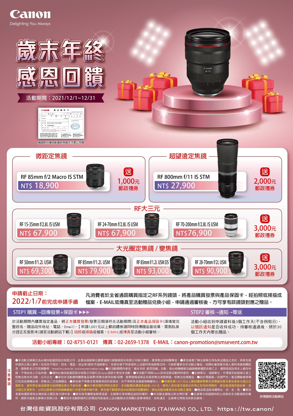 Canon 歲末年終,感恩回饋。買指定鏡頭送3,000元郵政禮券!活動時間:2021/12/1-12/31。
