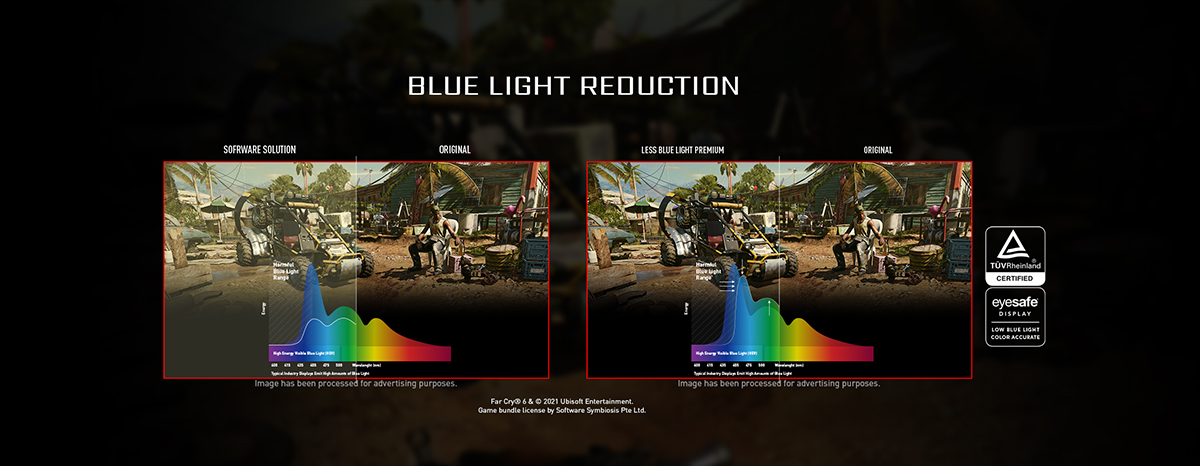 開啟減藍光後的屏幕變黃是常讓人難以忍受的一件事情,微星Optix MAG281URF / Optix MAG281URV顯示器「護眼模式」使用硬體解決方案來減少藍光光譜中藍紫色部分的發射光,讓屏幕不會犧牲任何顏色或圖像品質,EYESFAE認證硬體濾藍光,完美降低有害發光波長,保持色域和色溫,展現完美畫質和遊戲體驗,減輕對眼睛的負擔與傷害。