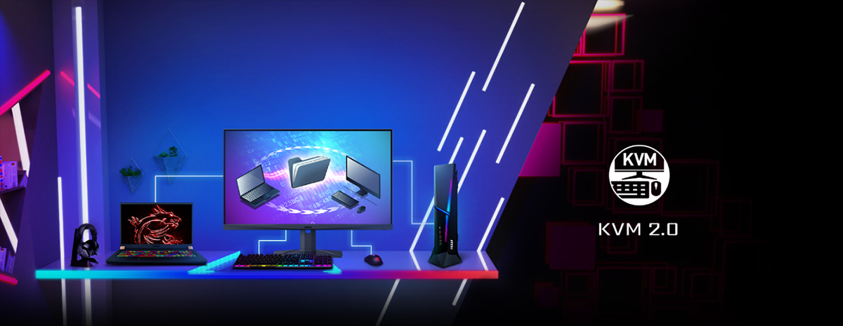 二款電競螢幕皆配置「KVM切換技術」,讓玩家能將鍵盤/滑鼠,透過顯示器輕鬆控制多個裝置設定。