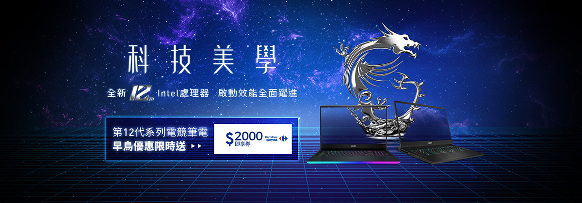 一直以來,MSI秉持著提供最優質且高效能的產品廣受玩家喜愛,更重要的是,MSI始終將全新電競技術在第一時間呈現在消費者面前。全新第12代Intel Core筆電平台登場之際,MSI宣布搭載最新第12代Intel ® Core™ H系列處理器的全新高效能筆電將陸續搶先開放預購,首波推出六款新品,包括全方位炫彩電競筆電Raider GE76/GE66、效能首選Vector GP76、纖薄質感黑魂Stealth GS66、熱血玩家指定Pulse GL76、Sword 15,為市場上領先首賣、產品最齊全的品牌!2022/1/24-2/20早鳥活動期間購買搭載最新第12代Intel ® Core™ H系列處理器筆電,至官網完成產品註冊及活動登錄,即可獲得家樂福電子禮券NT$2,000,數量有限,兌換完畢為止,詳情請見活動頁:https://tw.msi.com/Landing/2022-12th-rtx30-gaming-laptops/nb。