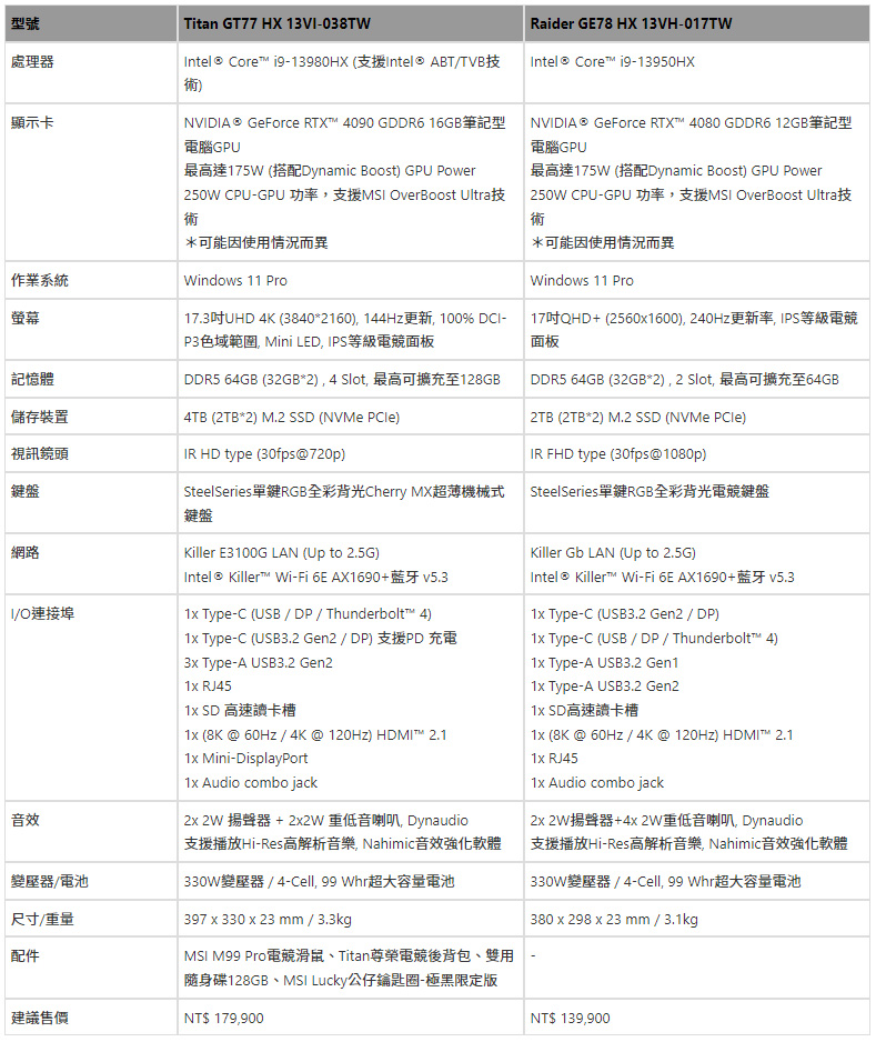 同樣獲得CES® 2023 創新獎殊榮的Titan GT77 HX搭載i9-13980HX處理器及GeForce RTX 4090筆記型電腦GPU,透過獨家MSI OverBoost Ultra超增壓模式設計,能將處理器與顯示卡推升至250W的極致效能,或CPU自動視工作需求將8個效能核心維持在5.2GHz渦輪加速高時脈。此外,Titan GT77 HX配備全球首款4K/144Hz Mini LED面板,超過1000 nits超高亮度及擁有最高能處理1000分區調光,並符合DisplayHDR 1000標準認證,能提供極致真實的色彩表現,極速更新率能幫助玩家在分秒必爭的遊戲中取得快速反應。Titan GT77 HX就是極致奢華與頂天效能的代名詞。