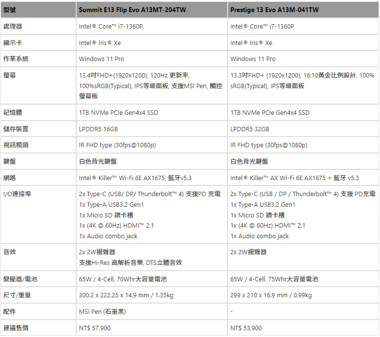 全新13吋的Prestige 13 Evo輕巧亮相,採用鎂鋁合金材質(Magnesium Aluminum alloy)打造、僅有990克的超輕薄機身,是MSI筆電產品中最輕量級的成員。Prestige 13 Evo纖薄機身中依舊配備了75 Whrs的大容量電池,提供最高達15小時的絕佳續航力,是行動工作者的最佳夥伴。Prestige 13 Evo即日起在台上市,搭載最新Intel® Core™ i7-1360P處理器,建議售價NT$ 53,900。