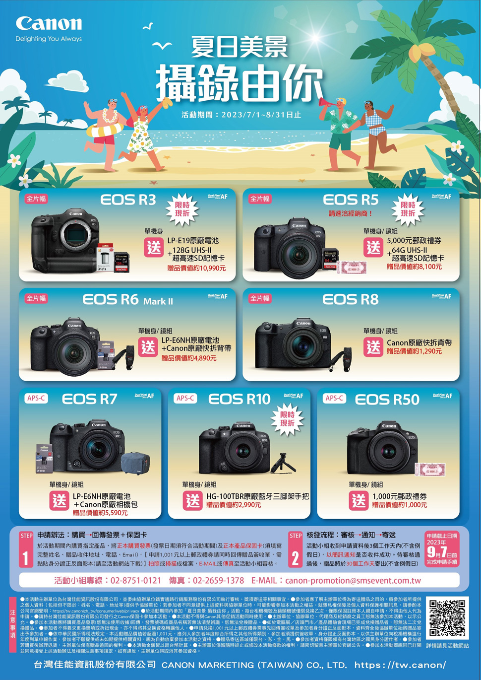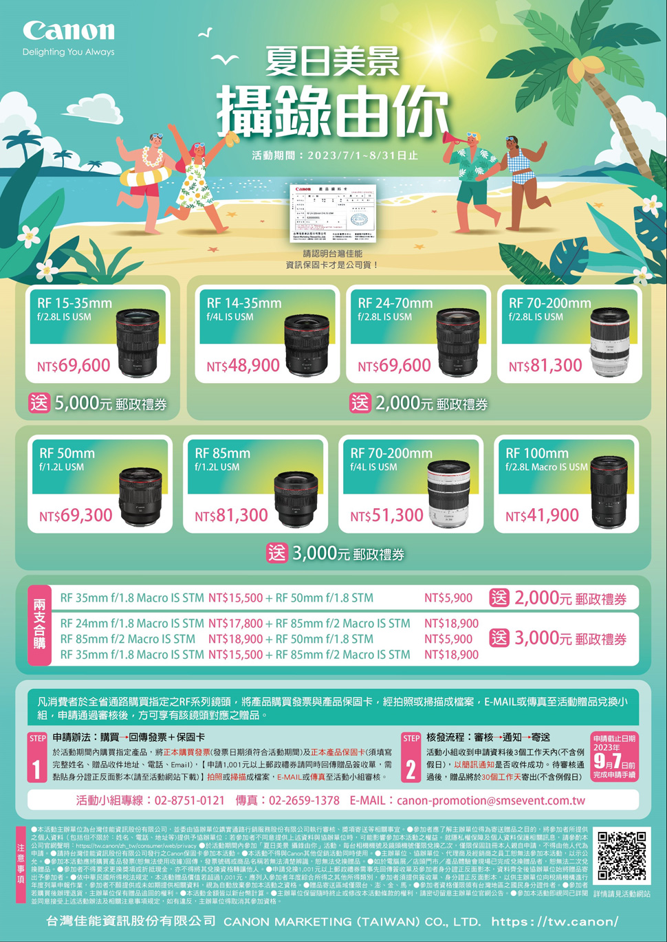 Canon夏日美景 攝錄由你!買指定鏡頭送郵政禮券!活動時間:2023/7/1-8/31。