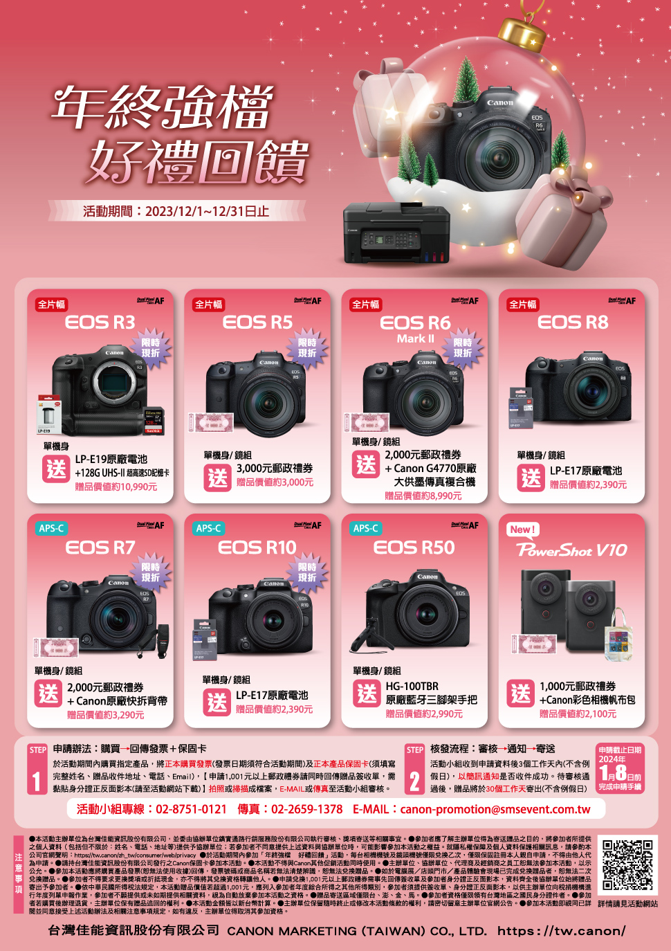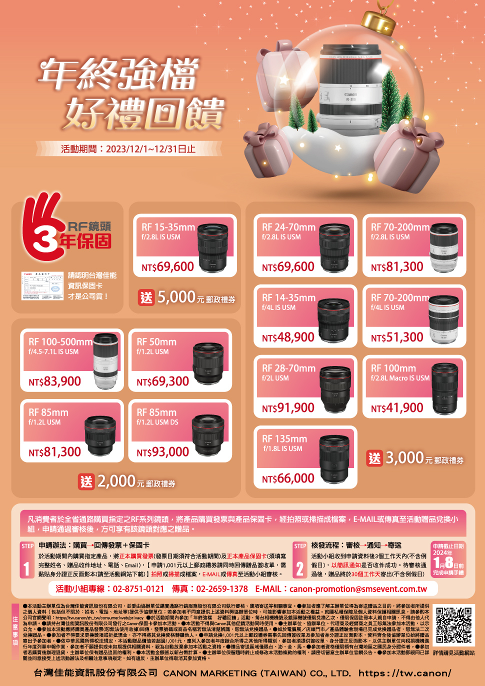 Canon年終強檔 好禮回饋!買指定鏡頭送郵政禮券!活動時間:2023/12/1-12/31。