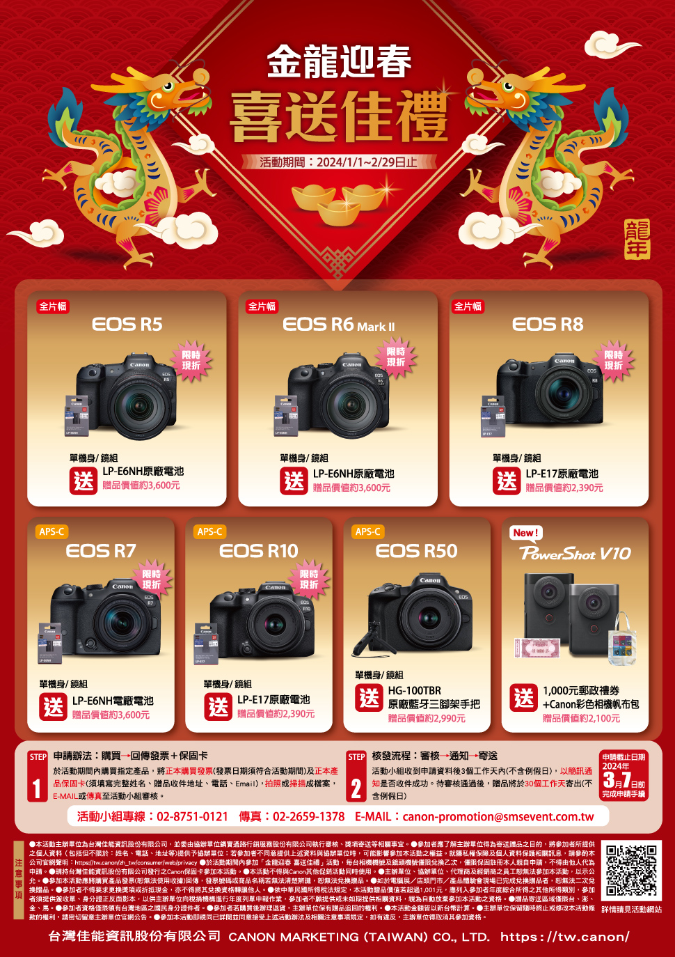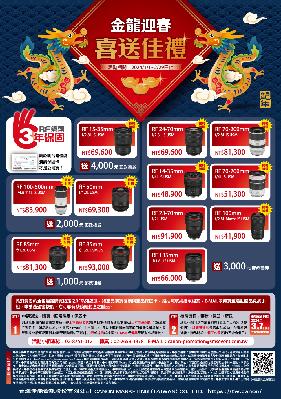 Canon金龍迎春 喜送佳禮!買指定鏡頭送郵政禮券!活動時間:2024/1/1-2/29。