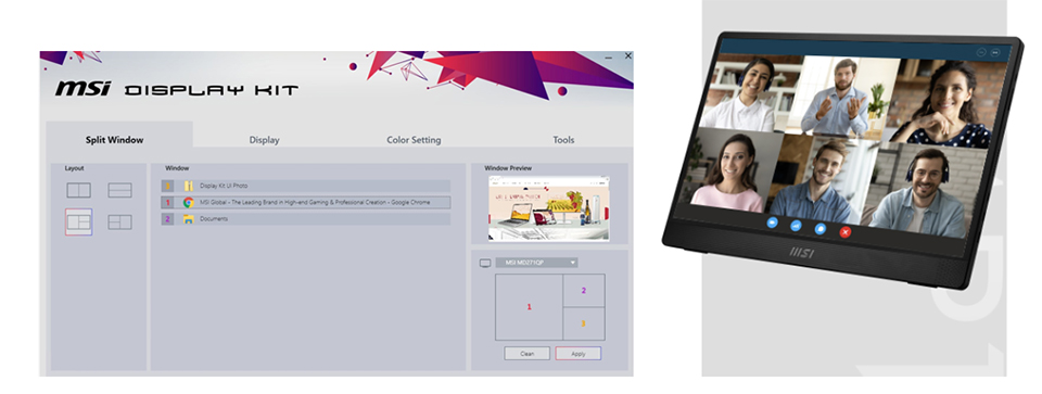 「PRO MP161 E2」內建2個喇叭,讓你輕鬆使用,搭配MSI獨家的「Display Kit軟體」提供用戶以方便的方式對螢幕進行分區作業,同時查看多個文檔或圖像,還可以利用色彩模式設定,例如:遊戲、劇院或護眼模式做畫面顏色調整…等。「Eye-Q Check」可提醒用戶避免長時間使用螢幕並做自我眼部護理測試,降低眼睛疲勞。