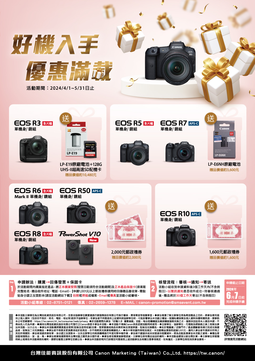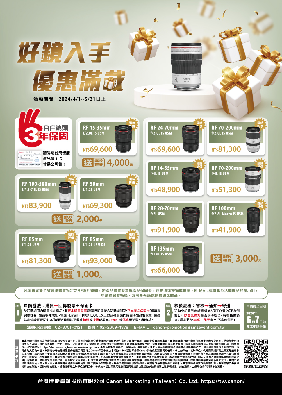 Canon好機/鏡入手 優惠滿載!買指定鏡頭送郵政禮券!活動時間:2024/4/1-5/31。