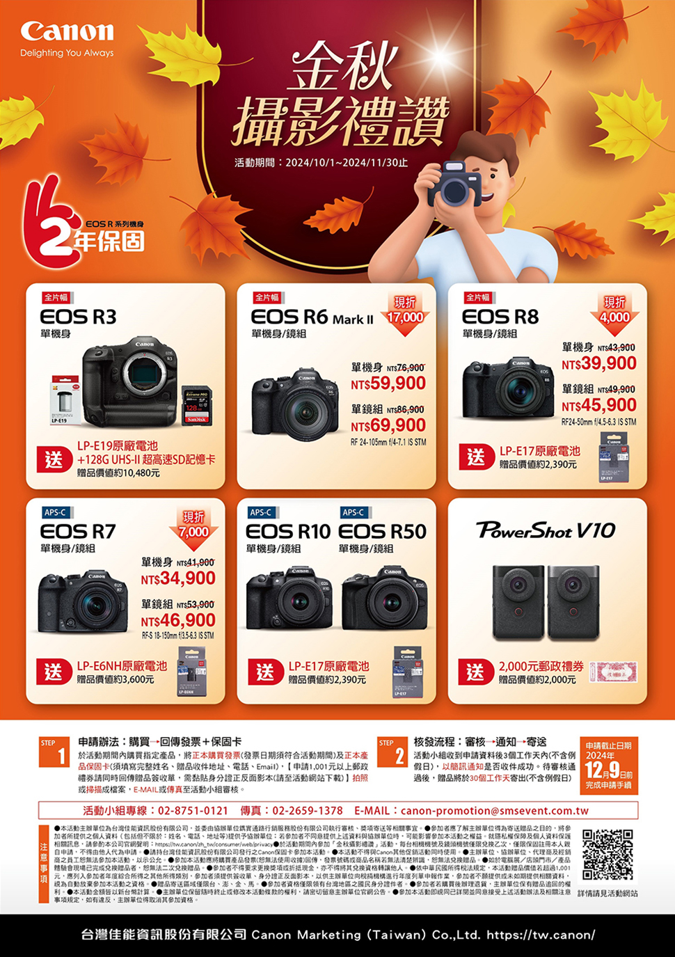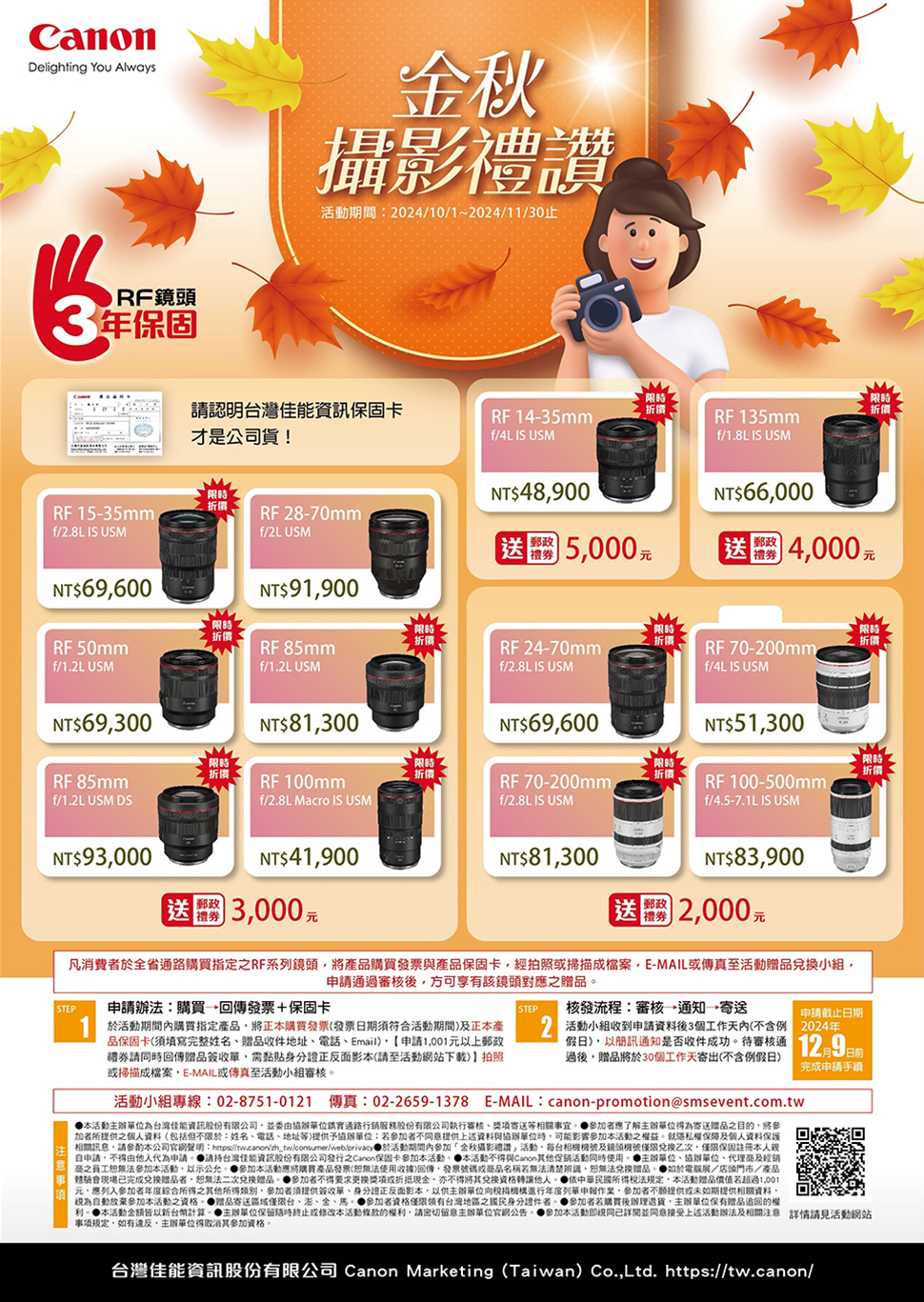 Canon 金秋* 攝影禮讚!買指定鏡頭送郵政禮券!活動時間:2024/10/1-11/30。