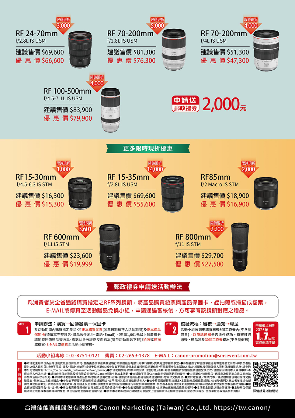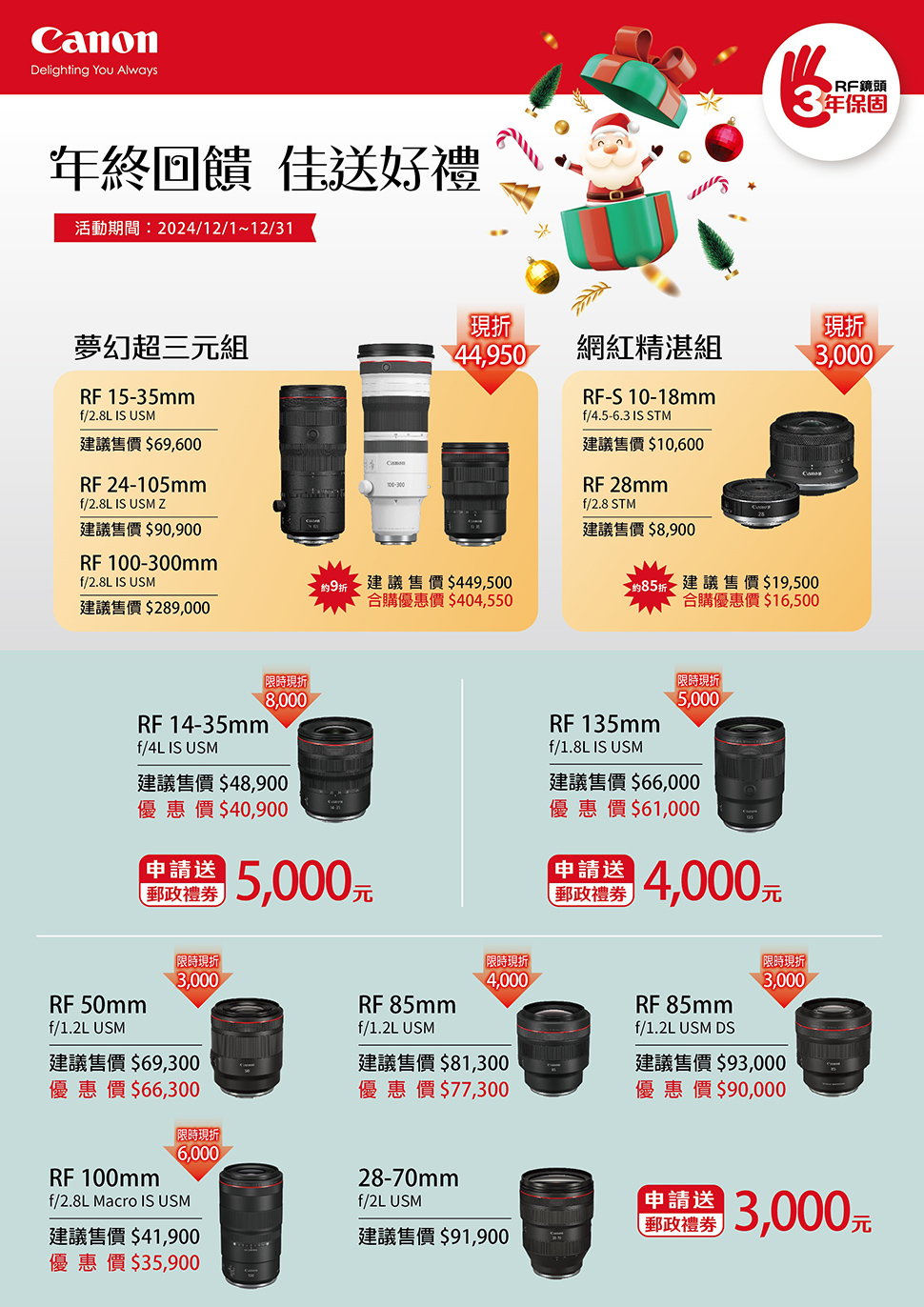 Canon 年終回饋 佳送好禮:《鏡頭篇》 活動時間:2024/12/1-12/31。