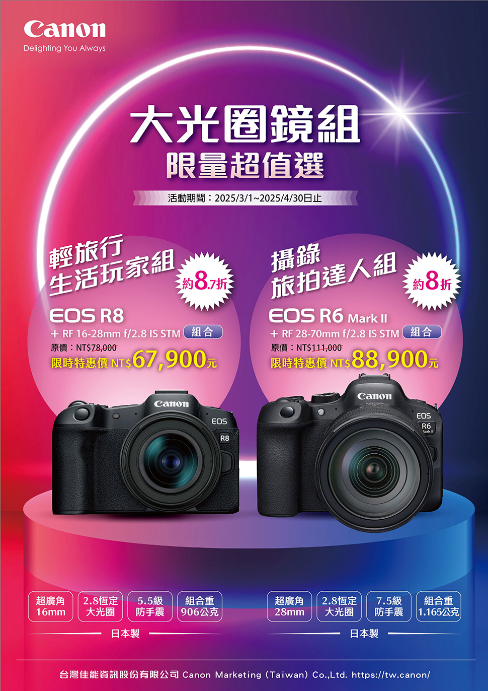 Canon 《大光圈鏡組 限量超值選》 活動時間:2025/3/1-4/30。