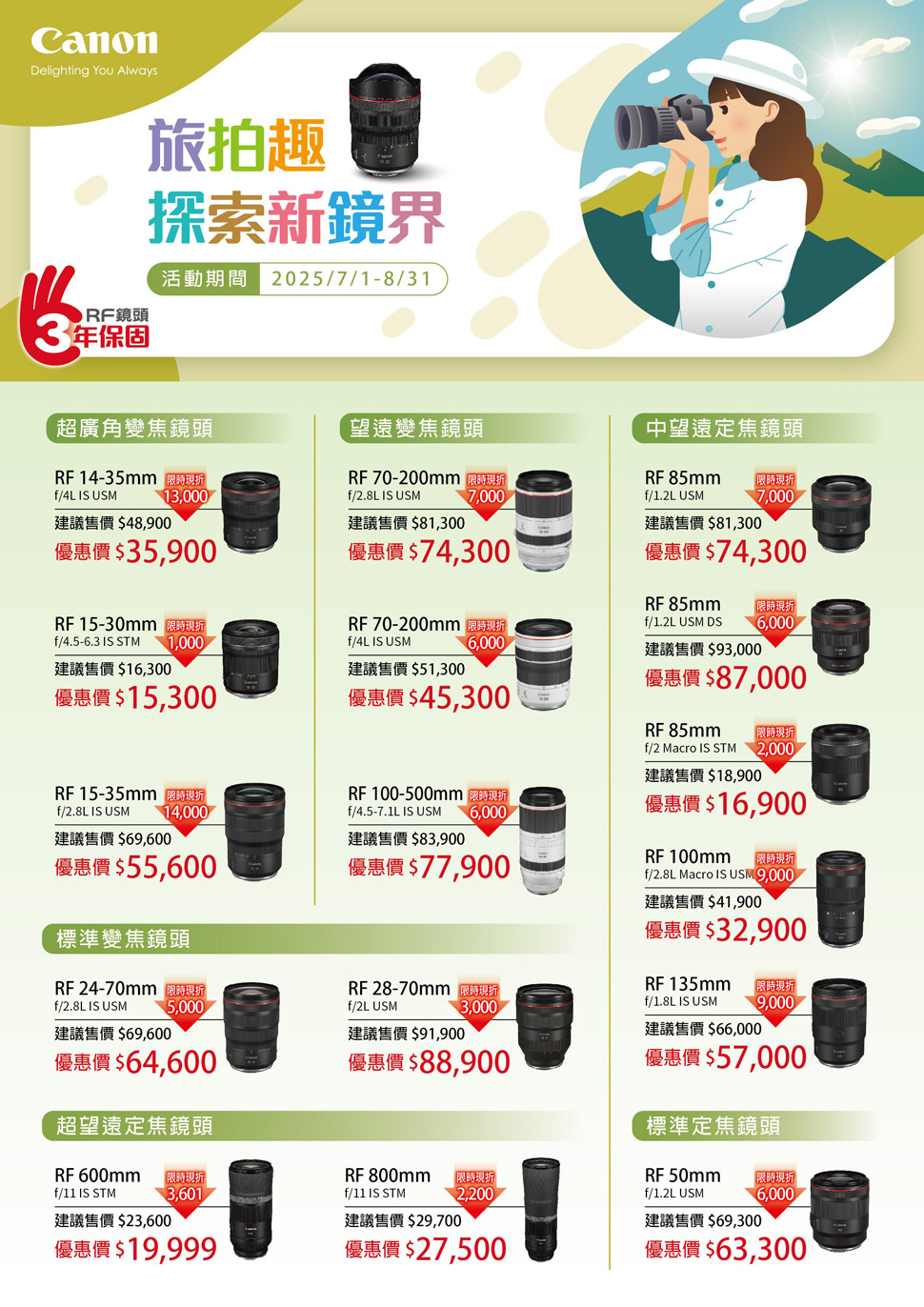 Canon 旅拍趣探索新鏡界:《鏡頭篇》 活動時間:2025/7/1-8/31。