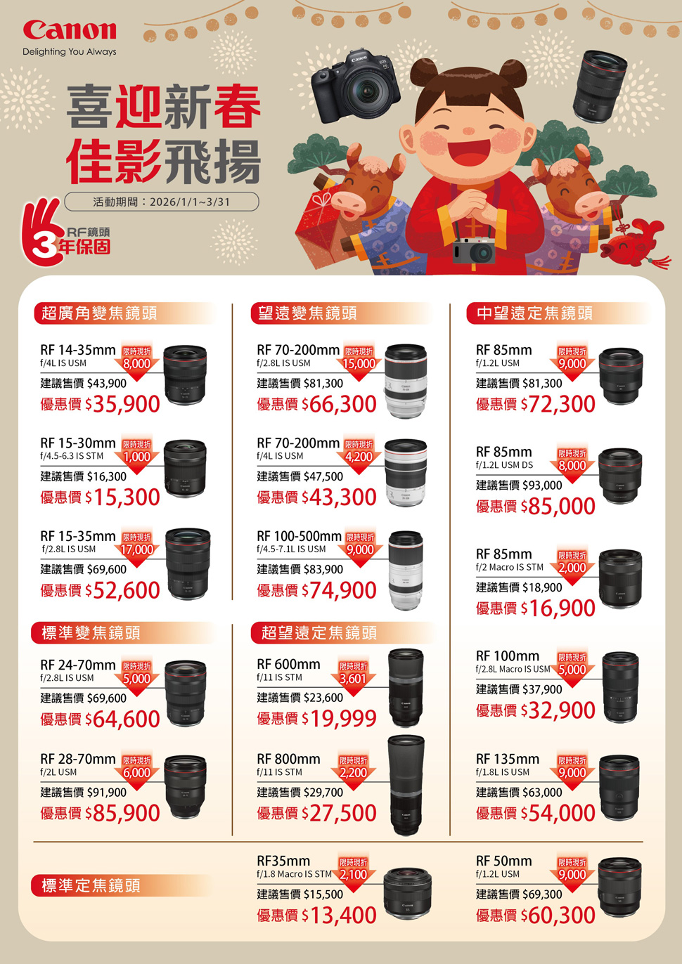 Canon 喜迎新春 佳影飛揚:《鏡頭篇》 活動時間:2026/1/1-3/31。