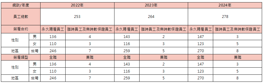 建達國際全體員工皆屬於永久聘雇員工類型,並提供部分工作機會給有兼職需求的人員,目前並無非員工工作者。公司提供長遠且安穩的工作型態,讓員工能夠全心投入工作而無後顧之憂,有助於保障員工的經濟生活。其次,女性員工與男性員工人數趨於對等。至於年齡分布而言,建達國際現階段以中壯年員工為主幹,由資深具有實務經驗的主管帶領年輕團隊衝刺,人力結構穩定,無發生人力缺口之虞。