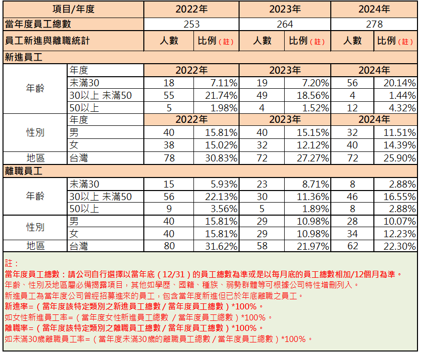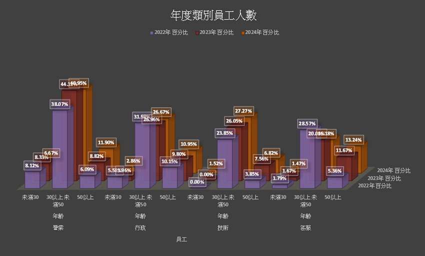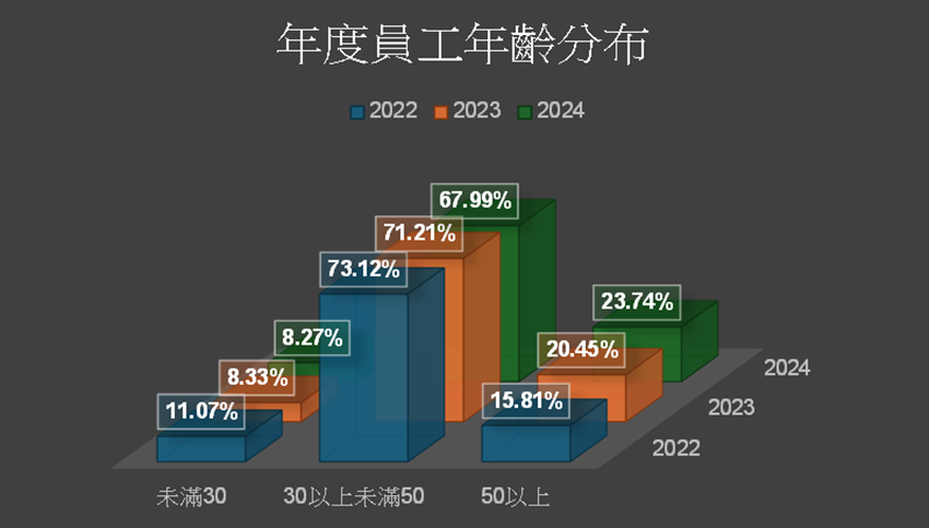 未滿30歲的直接人員百分比=(當年底未滿30歲的直接人員總數 / 當年底的員工總數)*100%。