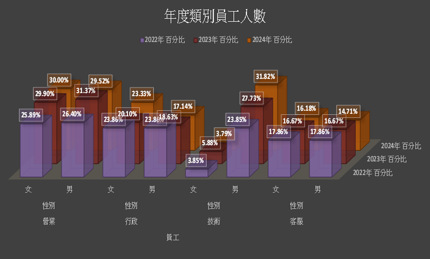 由於公司型態緣故,工作較為單純,員工多從事業務、行政、客服,技術類員工占部分,故受訓時數對比辦公室人員來說,技術類人員時數較多;同時倉庫的堆高機執照為必備固定回訓技能,並由公司全額補貼回訓費用。