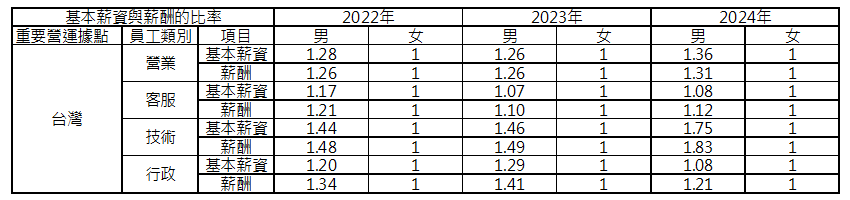 | 基層員工類別 | 性別 | 標準薪資與當地基本工資比率 |