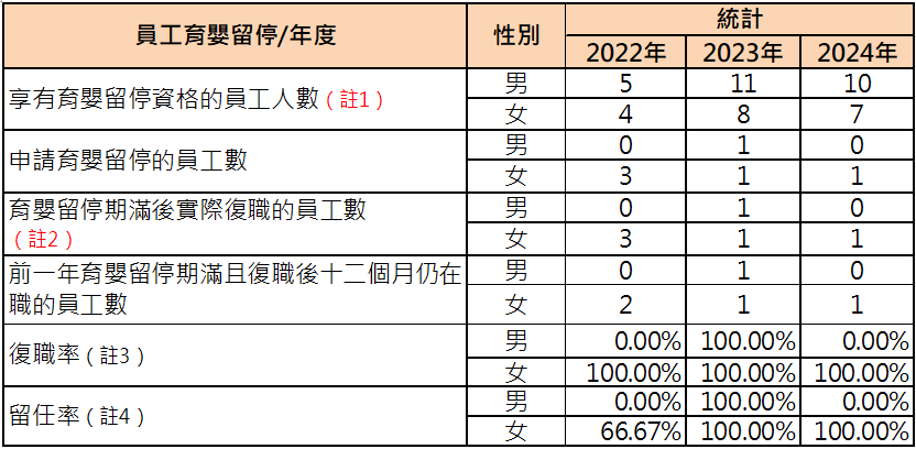 ※註3:復職率=(當年度實際復職員工總數 / 當年度應復職員工總數)*100%。