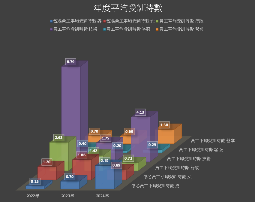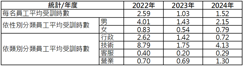 各類別員工平均受訓時數為(當年度該類別員工受訓總時數 / 當年底該類別員工總數)。