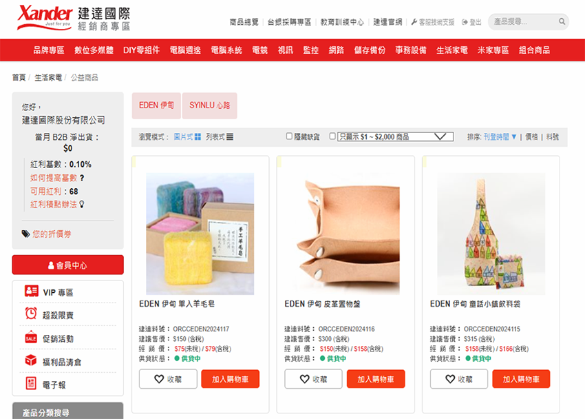 於建達國際經銷網站與『伊甸基金會』、『心路基金會』合作,上架銷售基金會成員所產製之文創商品、五折銷售予客戶、剩下費用由建達國際吸收價差,除協助基金會外,更寓意攜手客戶一同永續經營公益關懷。 |