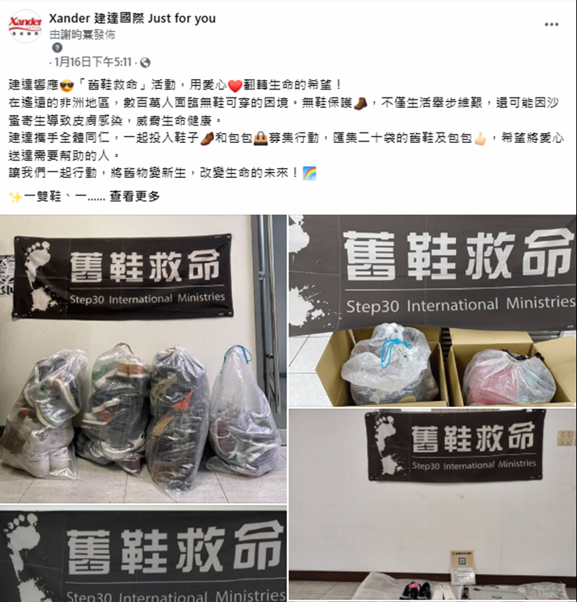 攜手『舊鞋救命國際基督關懷協會』舉辦全體員工彙集不需要的鞋子、包包等物資,送愛心到非洲,將不需要的物品送給需要的人。 |
