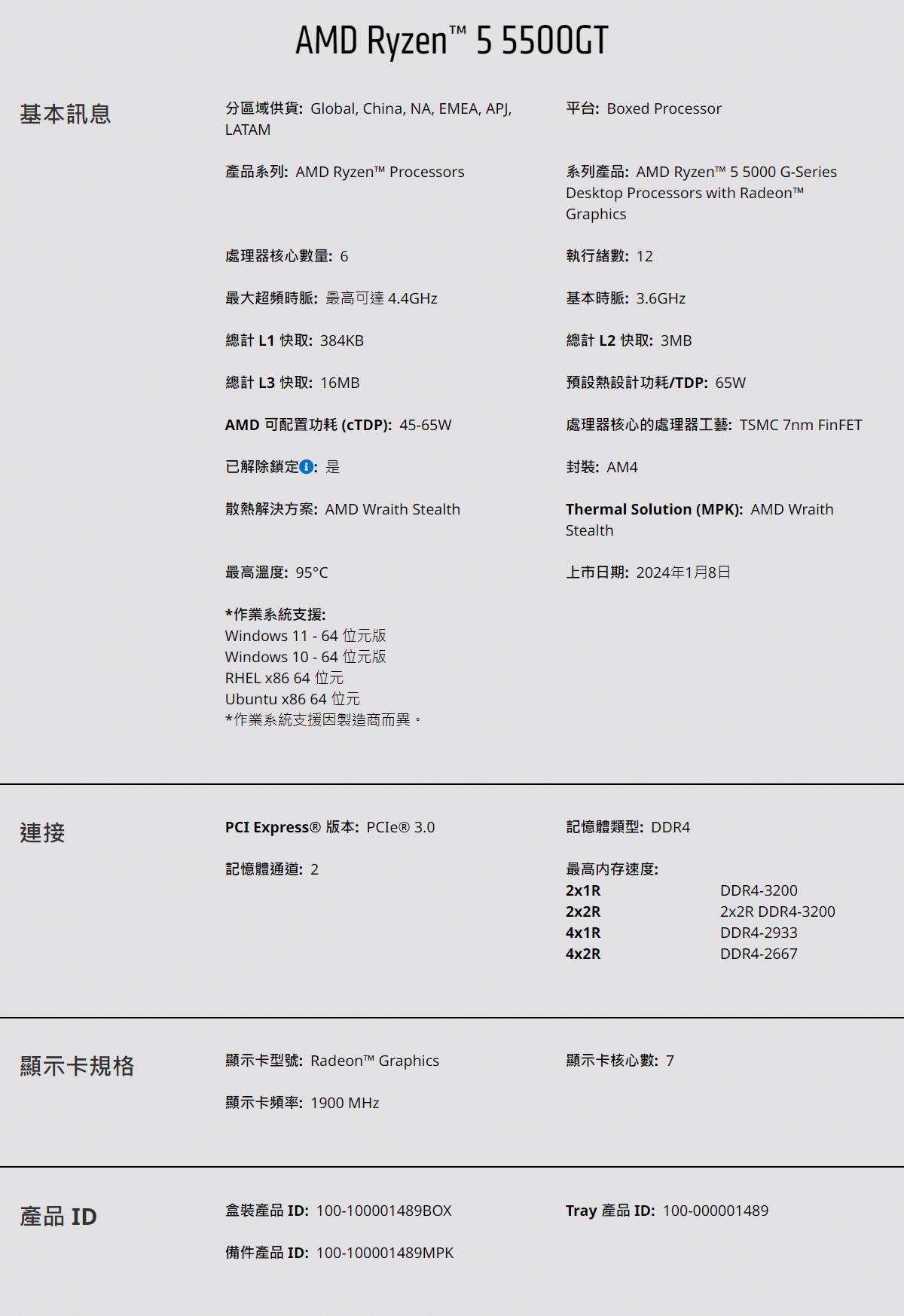 AMD Ryzen 5-5500GT 3.6GHz 6核心 中央處理器 ( 100-100001489BOX )