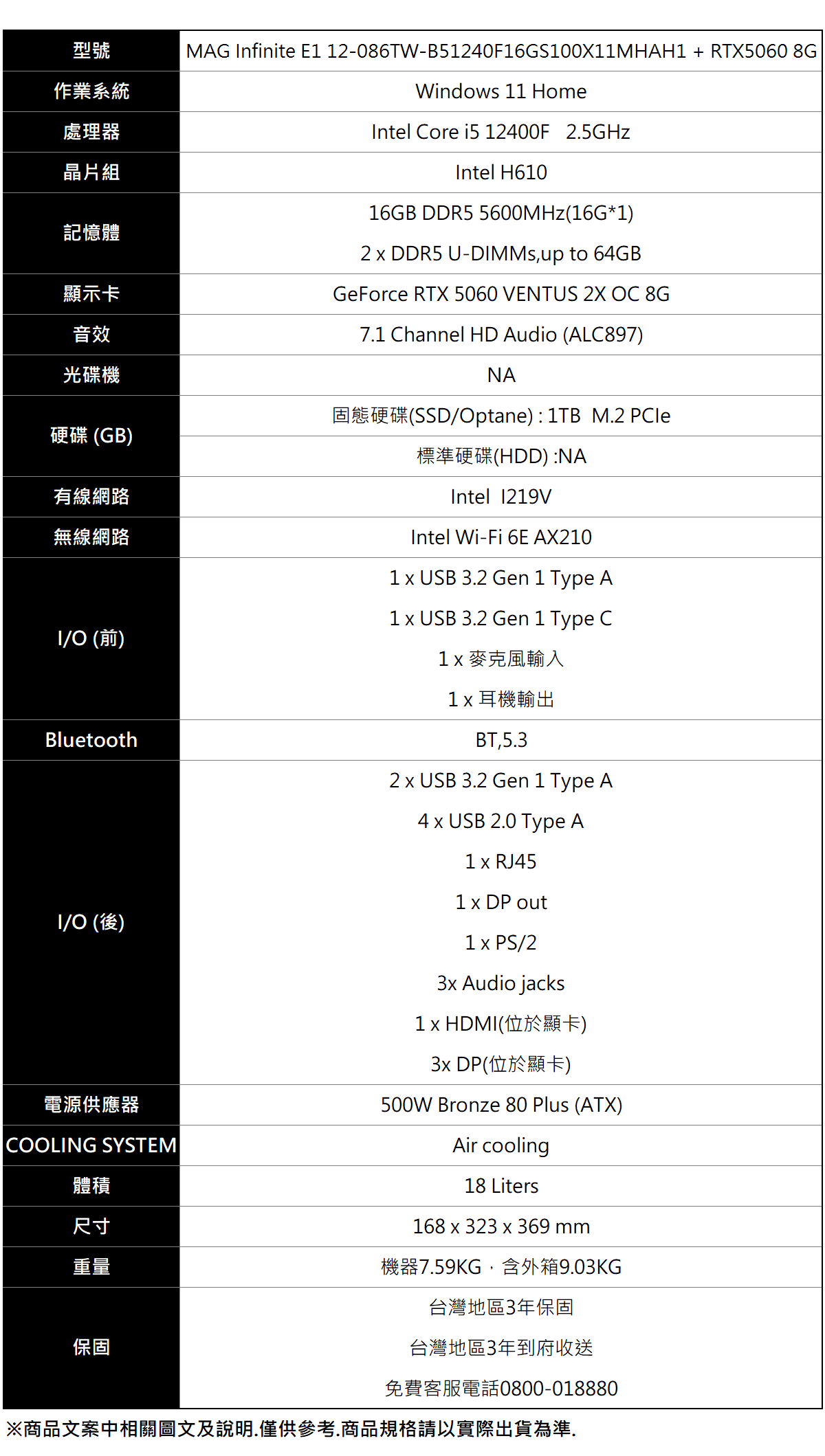 MSI Infinite E1 12-086TW(i5-12400F/16G/1T SSD/RTX 5060-8G VENTUS/W11) ( InfiniteE1 12-086+RTX5060 8G )